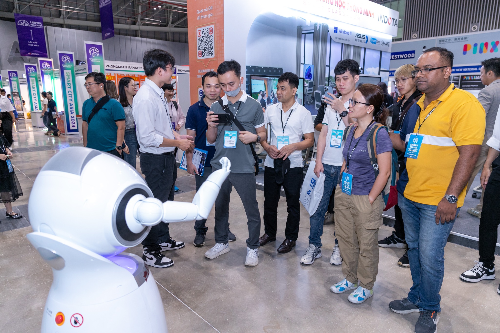 Các robot thông minh bận rộn phát tờ rơi, quảng cáo tại triển lãm quốc tế Đô thị thông minh châu Á - Ảnh: NHẬT XUÂN