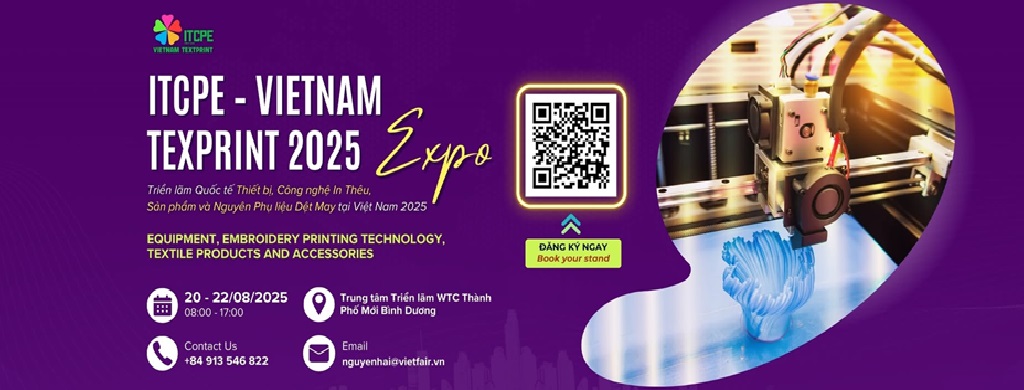 Từ ngày 20 – 22 tháng 8 năm 2025, tại Trung tâm Triển lãm WTC Bình Dương, P. Bình Dương, TP. Hồ Chí Minh, sẽ diễn ra Triển lãm Quốc tế Thiết bị, Công nghệ In Thêu, Sản phẩm và Nguyên Phụ liệu Dệt May tại Việt Nam – ITCPE – VIETNAM TEXPRINT 2025.