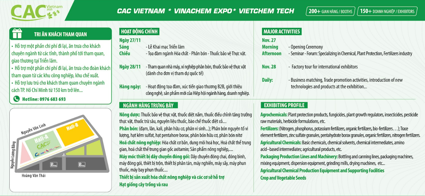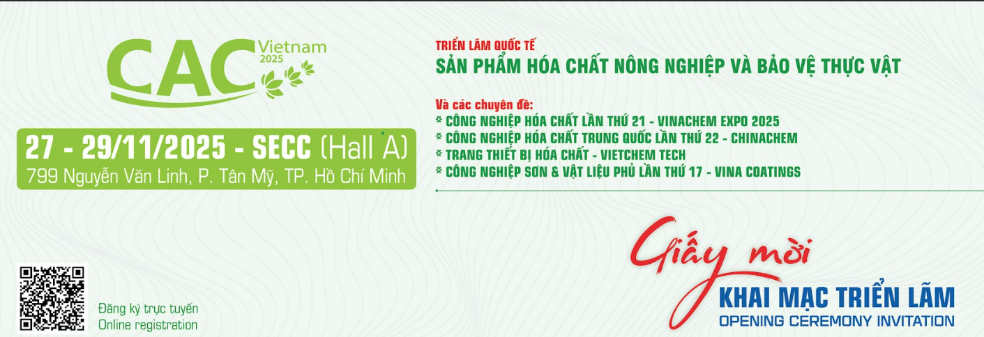 TRIỂN LÃM QUỐC TẾ SẢN PHẨM HÓA CHẤT NÔNG NGHIỆP VÀ BẢO VỆ THỰC VẬT TẠI VIỆT NAM – CAC VIETNAM 2025. Triển lãm sẽ chính thức diễn ra trong 03 ngày, từ 27 – 29/11/2025, tại Trung tâm Hội chợ & Triển lãm Sài Gòn (SECC) – Nhà A, TP. Hồ Chí Minh. Sự kiện được xác định là diễn đàn chiến lược và cầu nối thương mại quan trọng bậc nhất, dành riêng cho các doanh nghiệp sản xuất, nhập khẩu, và phân phối Thuốc Bảo vệ Thực vật (BVTV).